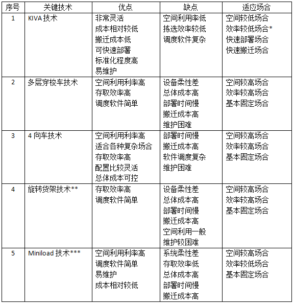 如果要細分貨到人揀選系統的技術(shù),主要在于快速存取技術(shù)和揀選工作站技術(shù)。有關(guān)這一方面的內容很多,目前市面上流行的存取技術(shù)有數十種之多,本文僅對幾種常用的存取技術(shù)進(jìn)行對比分析。如下表所示: